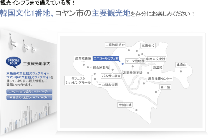 | 1990年初頭、一山新都市開発が始まる頃、京義線白馬駅付近のカフェ村が移されたエニコルカフェ村と、1990年代後半、一山新都市建設が完成する頃、新しくつくられた日本式専門食堂は高陽市民の思い出とロマンの生きる食べどころの名所となった |